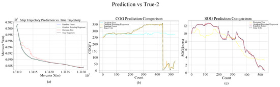 Figure 14 and Table 3 compares the predictions for the bulk carrier in terms of position, Course Over Ground (COG), and Speed Over Ground (SOG). Panel (a) compares the predicted ship positions across different models, where the Random Forest model’s predicted trajectory aligns most closely with the actual trajectory, indicating higher prediction accuracy and stability. The Gradient Boosting Regressor shows some deviation from the actual position, while the Decision Tree model exhibits larger discrepancies from the actual trajectory. Panel (b) compares the predicted COG across different models, with both the Random Forest and Gradient Boosting Regressor models closely matching the actual COG, demonstrating strong predictive performance; however, the Decision Tree model shows a significant gap compared to the actual COG, indicating poorer performance. Panel (c) compares the SOG predictions across different models, where the Random Forest model’s prediction curve closely aligns with the actual values at most data points, demonstrating very high prediction accuracy. In contrast, the Decision Tree model shows considerable deviation, and the Gradient Boosting Regressor provides moderate prediction accuracy.