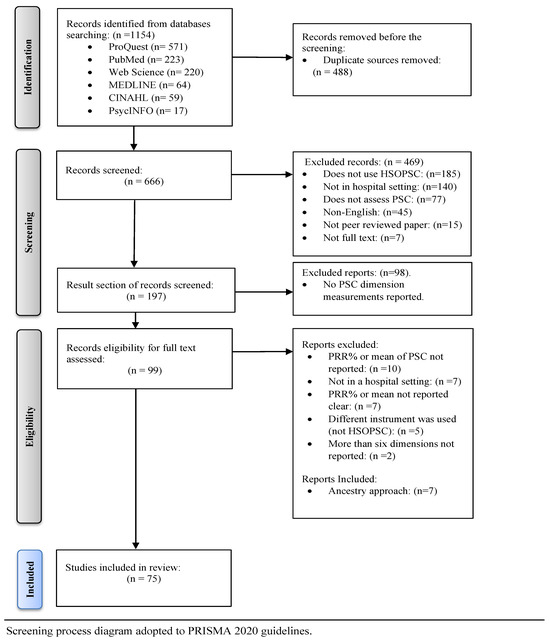 The selection of papers for this review went through several steps following the protocol of PRISMA 2020 [21], as illustrated in Figure 1. The flow diagram demonstrates the details in a structured and transparent manner. The initial studies were identified from databases searching 1154 sources, with the most entries coming from ProQuest 571, followed by PubMed 223, Web of Science 220, MEDLINE 64, CINAHL 59, and PsycINFO 17. The titles and article references were exported to Microsoft Excel so that the titles could be scanned, and duplicate references could be deleted, resulting in the removal of 488 records. The 666 titles and abstracts of papers were reviewed to ensure their relevance to the research question, and irrelevant titles and abstracts were removed, leaving 197 papers. After the scanning result sections, 99 papers were left for a full-text reading. Afterwards, 31 articles were excluded. The ancestry approach included seven studies, adding seven papers for the final number of included studies to be 75 research studies, as shown in Figure 1.