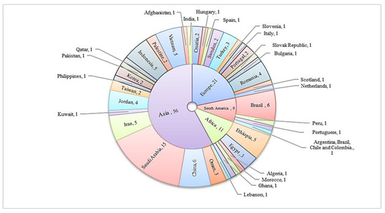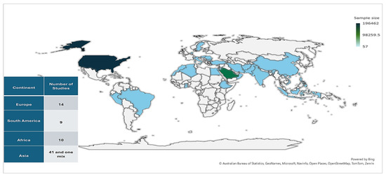 Based on Supplementary Materials and Table 2, this review involved 75 studies from intercontinental locations. Fourteen studies from Europe covered multiple countries, including Croatia, Hungary, Spain [29], Sweden [29,30], Turkey [23,31,32], Slovenia [33], Italy [34], Portugal [35,36], Slovak Republic [37], Bulgaria [38], Romania [39,40], Scotland [41], and the Netherlands [42]. Nine studies from South America encompassed countries such as Brazil [27,43,44,45,46,47,48], Peru [49], and Portuguese [48], with one study covering Argentina, Brazil, Chile, and Colombia [50]. Ten studies from Africa involved countries like Ethiopia [51,52,53,54], Egypt [55,56,57,58], Algeria [59], Morocco [60], and Ghana [61]. One study had a global focus, including Taiwan, the Netherlands, and the United States [42]. Finally, 41 studies from Asia covered a range of countries including Lebanon [62], Oman [63,64,65], China [25,66,67,68,69], Saudi Arabia [26,70,71,72,73,74,75,76,77], Iran [78,79,80,81], Palestine [82,83], Kuwait [84], Jordan [56,85,86], Taiwan [42,87], Philippines [88], Korea [22,89], Pakistan [90], Qatar [91], Indonesia [24,92], Vietnam [93,94,95], Afghanistan [96], India [28], and Indonesia [92].