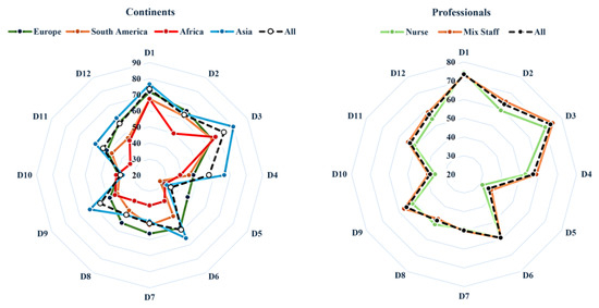 Figure 6 illustrates a comparison of continents’ and professionals’ mean response scores of each PSC dimension across all surveys with the mean of all. The difference between continents was noticeable compared to professionals. From Table 4, the descriptive analysis highlights variations in each dimension across all surveys. The highest mean score among dimensions was recorded at 73.4% for D3 (Organizational learning: continuous improvement) and D1 (Teamwork within units) with a score of 73.29%. Conversely, the lowest mean score for dimensions was 35.3% for D5 (Nonpunitive response to error). Furthermore, the highest disparity score was 19 for D4 (Management support for patient safety), while the lowest SD score was 11.4 for D7 (Communication openness).