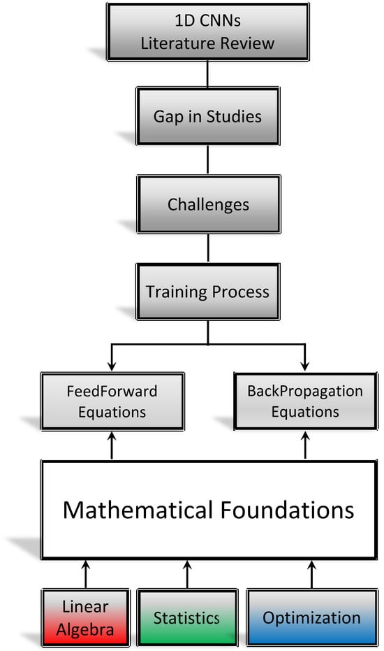 Our literature review on 1D CNNs has revealed gaps in studies, posing a challenge in fully addressing the theoretical elements required to derive all the equations involved in the training process (i.e., feedforward and backpropagation). The mathematical foundations we refer to include linear algebra, statistics, and optimization.