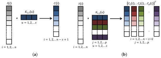 Let us consider an input vector I (size n) and a kernel (size s). Their convolution is represented by a new vector C (size ), as schematically shown in Figure 2a. It can be computed as follows: