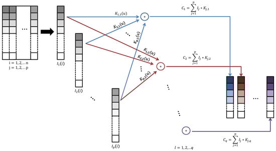 In this case, we can perform the convolution separately on each of the p columns using a multi-filter represented by a third-order tensor (size ). A 2D matrix (size ) results from a convolution operation. This 2D matrix can be regarded as an array of q columns (Figure 3), in which each column () is obtained by summing up p convolutions: