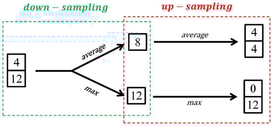Example of an up-sampling operation. The input is the array on the left. Down-sampling produces a 1D array based on the average or maximum of the input. During up-sampling, the 1D array is split into a new array. If averaging is used, the output is filled by evenly distributing the output value from down-sampling, in this case, dividing by 2. If the max operation is used, the output value is placed where the original maximum value occurred.