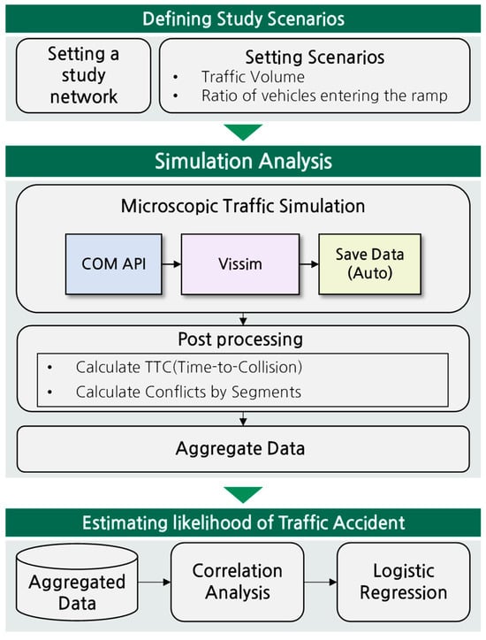 The accident risk analysis was conducted through a microscopic traffic simulation and involved setting up an analysis network on VISSIM [31], running simulations for each scenario, generating data for analysis, and performing logistic regression analysis. Figure 1 explains the research framework and shows how the study was conducted.