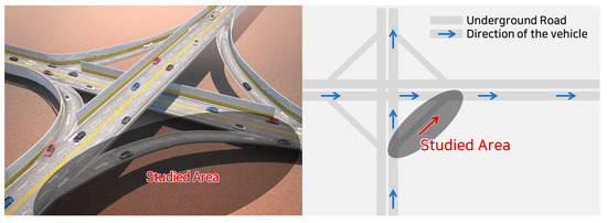 Because there are currently no existing three-dimensional intersections in operational underground roads in Republic of Korea, a virtual simulation network was constructed. The simulation network was set up according to the Highway Capacity Manual [32], Explanation of the Rules for Structural and Facility Standards for Roads [33], and Design Guidelines for Underground Roads in Urban Areas [34], which are the Korean design guidelines. The network consisted of a diamond-shaped underground-underground junction with a main line of 10 km and connections of 1 km.