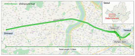 To construct the speed distribution, we used data from the Shinwol-Yeoui underground road in Seoul. Figure 3 shows the Shinwol-Yeoeui underground road in Seoul. The Shinwol-Yeoui underground road is a 7.53 km long road that connects Shinwol-dong, Yangcheon-gu district to Yeouido-dong, Yeongdeungpo-gu district. The road has a speed limit of 80 km/h from the Shinwol direction to Yeoui JCT and 60 km/h after Yeoui JCT. There are also two off-ramps from Yeoui JCT to Yeoui-daero and Olympic-daero, and the off-ramp to Olympic-daero is a single lane, which is similar to the simulation network in this study.