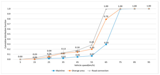 VDS (vehicle detection system) data collected for two months from 1 September 2021 to 31 October 2021 were used. Figure 4 shows the speed distribution set up for the underground road environment. Based on the average hourly section speed and traffic volume, we created speed distributions for the main line, diverging area, and road connection and applied them to VISSIM.
