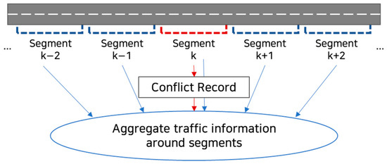 The processed data were aggregated by segment and time for analysis. The analysis area was divided into 50 m segments, with a total of 116 segments. The aggregation time interval was 1 s, and the information of 250 m worth of vehicles, including the center segment (k) and the two segments before and after it, was aggregated and used for the analysis, as illustrated in Figure 5 (i.e., the information was aggregated from 116 segments every second). Table 3 shows the final variables after data processing, and Table 4 presents a sample of the collected data.
