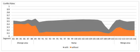 Figure 6 illustrates the difference in conflict rates by location between the without and with scenarios. It shows that diverge area, merge area, and ramp are the most common conflicts, with the with scenario having the highest conflict rates. This suggests that the proportion of conflicts on underground roads is higher than that on surface roads, and it is thus necessary to identify and manage variables that have a substantial effect on the safety of underground road junctions.