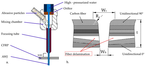 Abrasive water jet cutting (AWJC) offers many advantages over traditional cutting methods. It is highly versatile and capable of cutting a wide range of materials, including metals, composites, ceramics, glass, and stone [24]. AWJC is a cold-cutting process, which means that it generates no significant heat during the cutting operation. This is especially advantageous when cutting CFRP, as it eliminates the risk of heat-induced damage, such as thermal degradation, preserving the material’s integrity and mechanical properties [17,25,26]. AWJC offers good precision, allowing for intricate and complex shapes to be cut with high accuracy [27,28]. This level of precision is particularly beneficial for CFRP components used in aerospace, automotive, and other high-performance industries, where tight tolerances and detailed geometries are often required [3,29]. The AWJ produces clean and smooth edges on CFRP components. The narrow kerf width of AWJC results in minimal waste of material. This is particularly important for expensive materials like CFRP, for which reducing waste can lead to significant cost savings and more efficient use of resources [11].