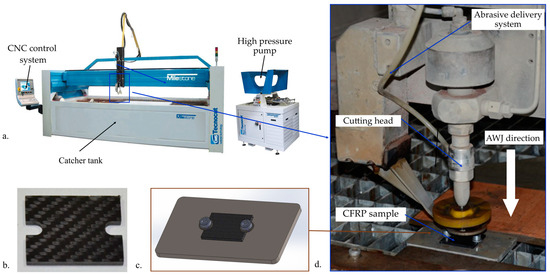 Figure 2 illustrates the experiment setup. Table 2 presents the experimental parameters used in this study. The CFRP specimens were cut using AWJ at dimensions of 60 mm × 60 mm (Figure 2b) and clamped using screws in a custom clamping system (Figure 2c).