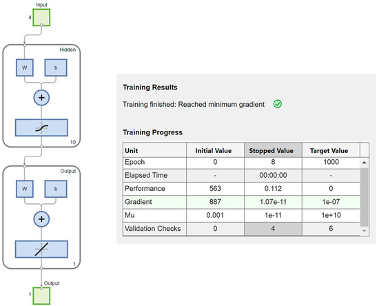 Initially, the data were imported from an Excel file where the training data were stored. The data were then divided into distinct subsets for training (70%), validation (15%), and testing (15%). A neural network was defined (Figure 3) and trained for a number of epochs until the change in error was very small. The performance of the trained network was then evaluated through metrics such as mean squared error and regression analysis. Finally, the results were analyzed using visualization techniques, including regression fit plots and error histograms.