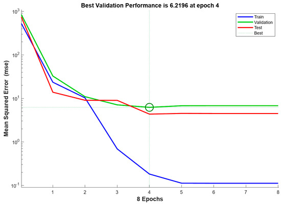To investigate the neural network performance, the mean squared error (MSE) was involved. The performance plot graph (Figure 4) represents the MSE of the neural network during the training, validation, and testing phases.
