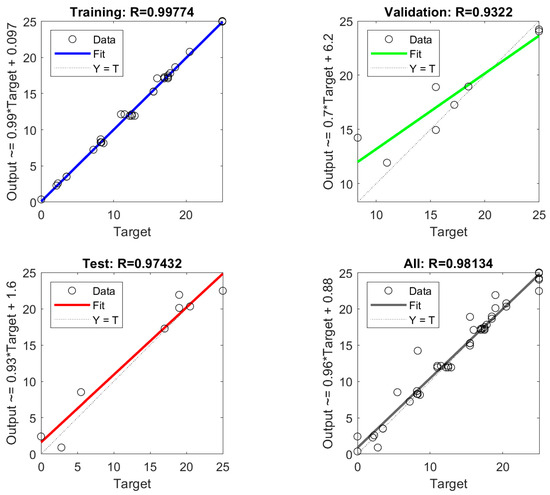The set of plots shown in Figure 5 illustrates the regression analysis of the neural network’s performance across different phases: training, validation, testing, and overall. Each plot compares the network’s predicted outputs to the actual target values and provides the correlation coefficient (R), which indicates how well the predicted outputs match the actual targets.