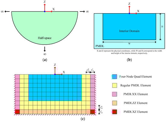 (a) Half-space problem; (b) Interior domain with PMDLs; (c) Four types of PMDL elements.