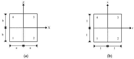 In Equations (1) and (2), and refer to the lengths of the j-th real layer in the x- and z-directions, respectively. Similarly, and represent the lengths of the k-th imaginary layer in the x- and z-directions. The variables and indicate the reference velocities in the x- and z-directions. The parameters and correspond to the number of real and imaginary layers, respectively. stands for the height of the interior domain, while and represent the excitation frequency and Poisson’s ratio, respectively. Figure 3a,b illustrates the global and local coordinates for the PMDLs. Additionally, the dynamic stiffness matrix of the element is calculated using (3), as outlined by [44,45].