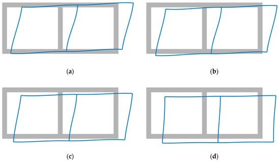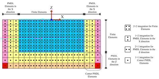 In Equations (3)–(20), a and b denote the half-width and half-height of the rectangular PMDL element. S, K, M, C, and R represent the dynamic stiffness, stiffness, mass, damping, and auxiliary matrices, respectively, while represents the material density. PMDLs should be modeled with elastic material, while the interior domain (Figure 2b), along with the substructure and superstructure, can be represented using either elastic or nonlinear materials. A key feature of the PMDL elements is the use of midpoint integration to eliminate discretization errors. As shown in Figure 4, the model that includes PMDL elements utilizes four types of integration rules: 2 × 2 integration for finite elements within the interior domain, 1 × 2 integration for PMDL elements in the X direction, 2 × 1 integration for PMDL elements in the Z direction, and 1 × 1 integration for corner PMDL elements. Table 1 illustrates the abscissas and weights of the numerical integration methodologies.