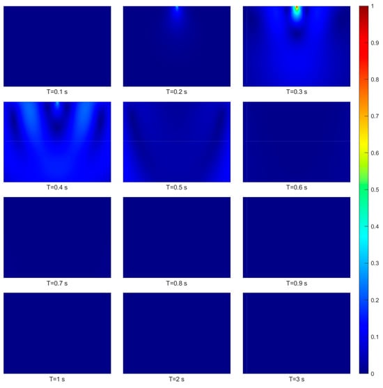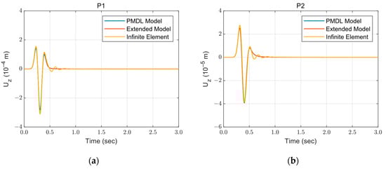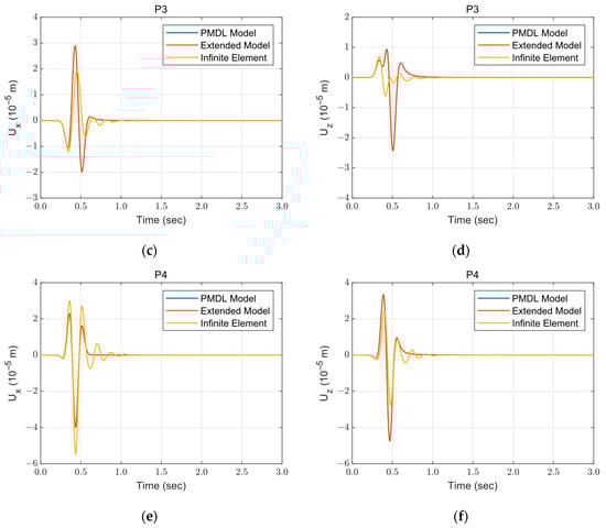 Figure 7 illustrates the comparisons of displacements obtained using the PMDL, infinite elements, and the extended domain for selected points. For points P1 and P2, only vertical displacements are shown, while for points P3 and P4, both horizontal and vertical displacements are presented. As depicted, the PMDL boundary performs excellently across all selected points, whereas the infinite elements do not perform as well. The infinite elements fail to perfectly absorb outgoing waves, leading to reflected waves re-entering the domain of interest. This results in discrepancies between the results from the domain using infinite elements and those from the PMDL and extended domain. These discrepancies are particularly evident in the vertical displacement at point P3. Additionally, Figure 8 displays contour plots of normalized displacement magnitudes at various times (t = 0.1, 0.2, 0.3, 0.4, 0.5, 0.6, 0.7, 0.8, 0.9, 1.0, 2.0, 3.0 s) using the PMDL boundary, further demonstrating its effectiveness in absorbing all outgoing waves.