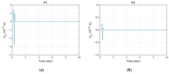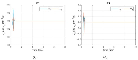 A simulation with a total duration of 10 s was performed to assess the long-term stability of the PMDL. Figure 9 shows the displacement histories for the four selected points, whose locations are indicated in Figure 5b. The results reveal that the entire domain falls silent after approximately t = 1 s, with no reflections occurring between the PMDL boundary and the domain of interest.