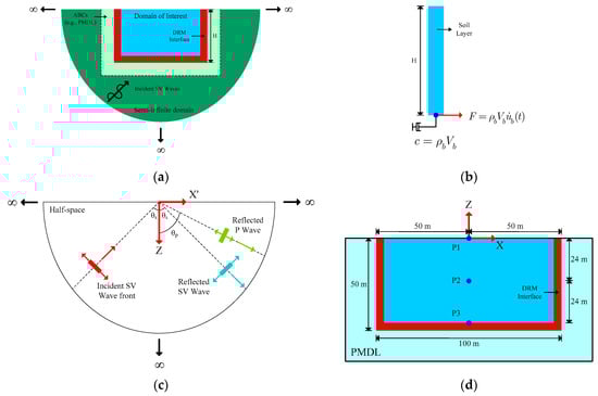 (a) Modelling of a half-space domain using ABCs and DRM; (b) equivalent 1-D SRA for estimation of free-field response for DRM; (c) schematic representation of SV wave propagation in a 2D homogeneous half-space; (d) numerical model constructed for DRM verification problem.