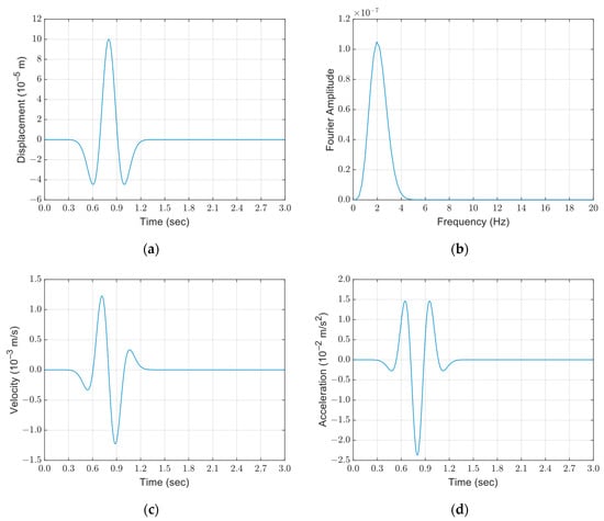 Plots for the applied Ricker pulse include; (a) displacement, (b) Fourier amplitude, (c) velocity, and (d) acceleration.