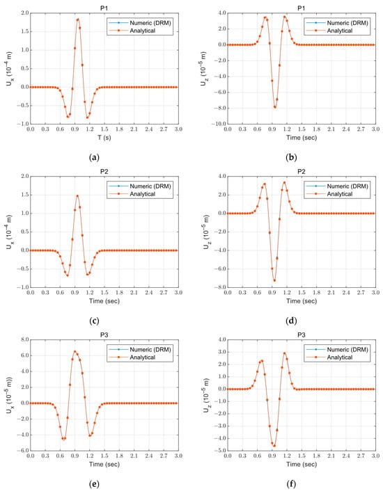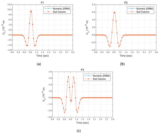 Figure 12 and Figure 13 show the displacement histories for the selected points (refer to Figure 10d), acquired from the DRM, 1-D SRA, and the analytical solutions. The DRM results closely align with both the analytical solutions and 1-D SRA.