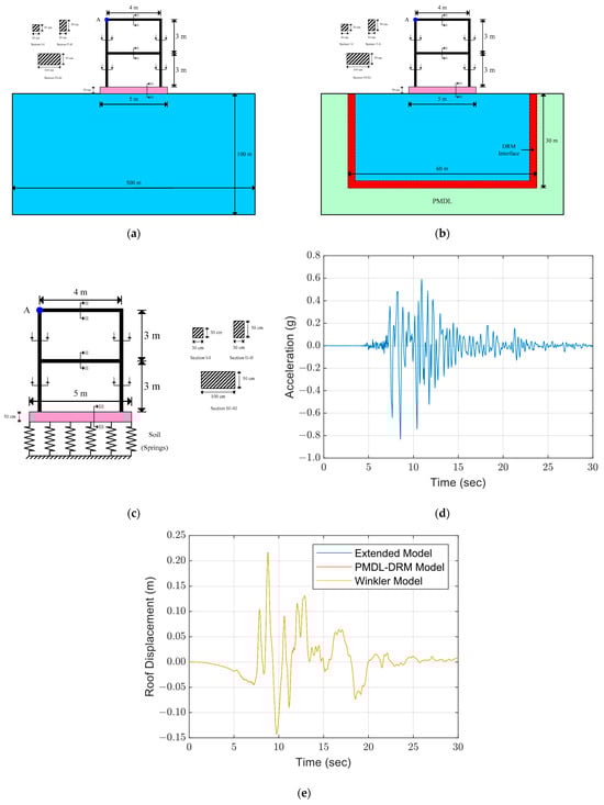 (a) Extended domain model, (b) PMDL-DRM combined model, (c) Winkler model, (d) acceleration time-history of the Kobe earthquake, and (e) comparison of the roof displacements of three distinct models.