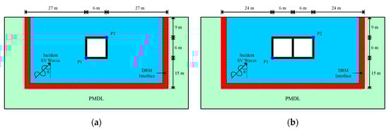 As documented in [47,48], the angle of incidence has been demonstrated to exert a considerable influence on the response of tunnels, particularly those with a vertical orientation. This section presents an examination of a single-cell tunnel and a double-cell tunnel in homogeneous media subjected to SV waves at varying angles of incidence. The numerical models are illustrated in Figure 15. The DRM interface is employed to define the input motion, while the PMDL is utilized to truncate the domain and mitigate the effects of scattering waves. The input motion is identical to that utilized for validating the DRM implementation (see Figure 11). Four-node quadrilateral plane-strain elements are employed for the domain of interest, while two-node frame elements are utilized for the tunnel structures, with the latter having a thickness of 0.50 m. The contact between the soil and the tunnel is assumed to be bonded. The material properties for the soil and the tunnels are given in Table 4.