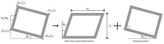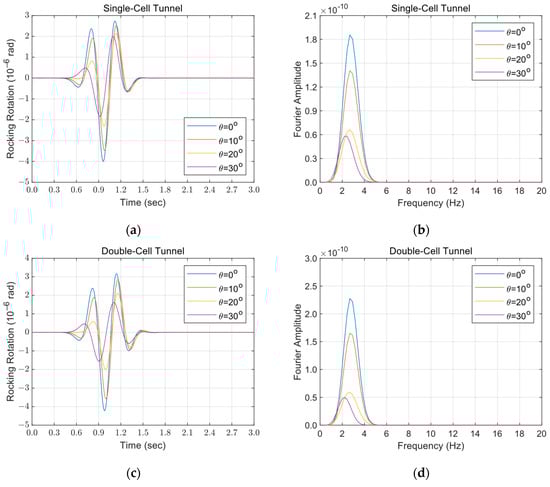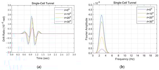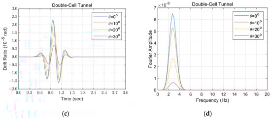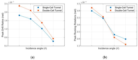 In Equation (33), refer to the drift ratio and rocking rotation, respectively. The shear and rocking deformation (see Figure 16) of the tunnel structure are depicted in Figure 17 and Figure 18. In Figure 16, and denote the width and height of the tunnel. The method for calculating the drift ratio (shear deformation) and rocking rotation is outlined in (33). Initially, we compared the drift ratios and rocking rotations between single-cell and double-cell tunnel structures. As shown in Figure 17 and Figure 18, for this specific scenario, the drift ratios and rocking rotations increase as the incidence angle decreases. Additionally, the Fourier amplitudes of these drift ratios and rocking rotations are calculated and presented in Figure 17 and Figure 18. These figures illustrate that the Fourier amplitude of the drift ratios and rocking rotations decreases with an increasing incidence angle. Figure 19 displays the peak drift ratios and rocking rotations according to the angle of incidence. It is evident from Figure 19 that the peak drift ratios and rocking rotations decrease with an increasing angle of incidence in both single-cell and double-cell tunnels. Moreover, for a specific incidence angle, the lowest drift ratios are observed in the single-cell tunnel. From Figure 19, it is clear that at incidence angles of 0° and 10°, the largest rocking rotations occur in the double-cell tunnel, whereas at angles of 20° and 30°, the largest rocking rotations are observed in the single-cell tunnel.