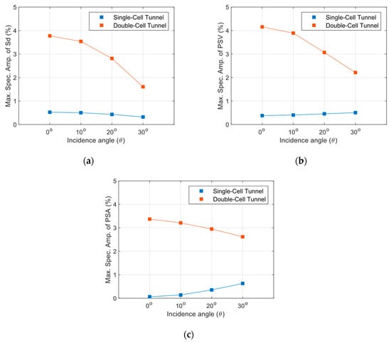 Figure 20 illustrates the maximum spectral amplification (as percentages) at the ground surface, caused by the presence of a subsurface tunnel structure. The said percentages are obtained by first calculating the difference between the spectral values when considered with and without tunnel structures, and subsequently dividing these differences by the corresponding spectral values for the case where there is no tunnel structure. As illustrated in Figure 20, the amplification percentages of spectral values for the single-cell tunnel decrease as the angle of incidence increases. For the double-cell tunnel, the amplification percentages of Sd and PSV remain nearly constant. Conversely, the amplification percentages of PSA for the double-cell tunnel increase with the angle of incidence. At a specific angle of incidence, the highest amplification percentages are observed in the single-cell tunnel.