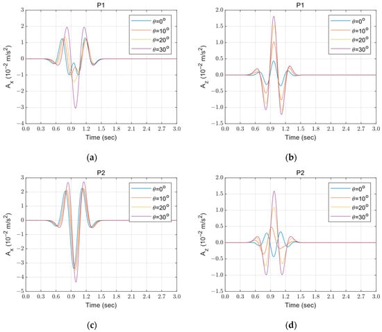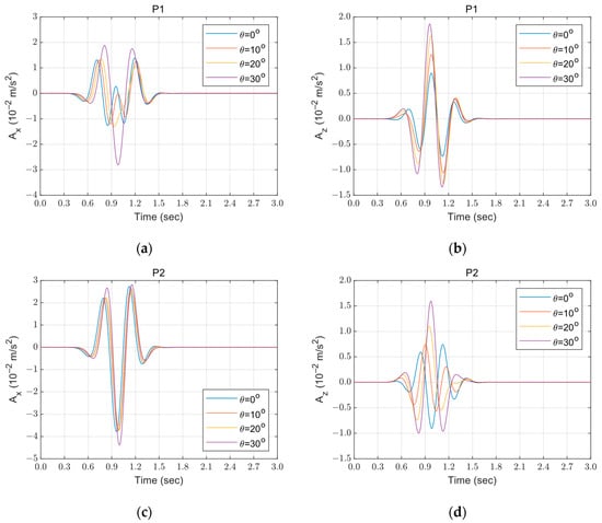 Finally, the accelerations at two selected points on the tunnel (P1 and P2, see Figure 15) are compared. As shown in Figure 25 and Figure 26, the maximum horizontal and vertical accelerations are observed at an incidence angle of 30° for both the single-cell and double-cell tunnels, respectively. Additionally, Figure 25 and Figure 26 indicate that the vertical accelerations increase with the angle of incidence.
