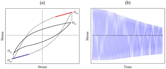 The peak compression and peak tensile stress reduction criteria [15] consider that the mechanical properties of the material decrease over its lifetime. These two criteria are defined as follows: failure is considered to have occurred when the tensile stress reaches of its maximum value or when the compressive stress reaches of its maximum value. Figure 3b shows a schematic representation of the peak compression and peak tensile stress reduction criteria [15].