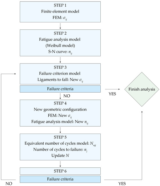 Step 6: check the failure criteria. If the failure criteria have been satisfied, the analysis ends, and the number of cycles to failure is defined. If the failure criteria are not satisfied, the model returns to Step 3. Figure 4 shows a flow chart representation of the proposed model.