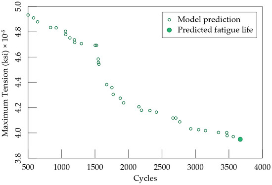 Figure 5 shows the results obtained using the proposed model, considering a constant strain amplitude of 0.003. The figure shows the relation between the maximum tension and number of cycles to failure of the open-cell metal foam. According to the proposed model, the predicted maximum tension is ksi ( of ksi), with a predicted fatigue life of 3600 cycles.