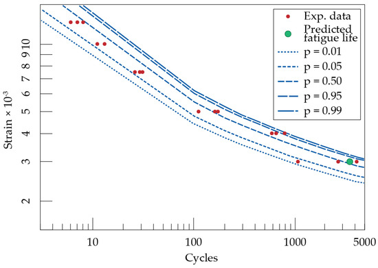 Table 1 provides a summary of the experimental results. The data in Table 1 were used in the Weibull E-N model to generate the whole E-N field curves indicated in Figure 6. Figure 6 shows the percentile curves of p = 0.01, 0.05, 0.5, 0.95, and 0.99 with blue lines. The percentile curves represent the probability of foam failure. Additionally, the experimental data of Table 1 are indicated with red dots, and the predicted fatigue life using the proposed model with a green dot.