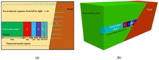 Three-dimensional discrete element numerical computation model: (a) fault-tunnel-surrounding rock system; (b) excavation model of tunnel approaching the water-rich fault.