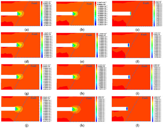 Axial deformation of the face when the tunnel is approaching to fault with different water pressures (Unit: m): (a) p = 1 MPa, fourth excavation; (b) p = 1 MPa, fifth excavation; (c) p = 1 MPa, sixth excavation; (d) p = 1.5 MPa, fourth excavation; (e) p = 1.5 MPa, fifth excavation; (f) p = 1.5 MPa, sixth excavation; (g) p = 2 MPa, third excavation; (h) p = 2 MPa, fourth excavation; (i) p = 2 MPa, fifth excavation; (j) p = 2.5 MPa, third excavation; (k) p = 2.5 MPa, fourth excavation (l) p = 2.5 MPa, fifth excavation.