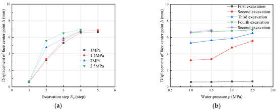Curve of displacement change of tunnel face center: (a) displacement varies with excavation steps; (b) displacement varies with water pressure.
