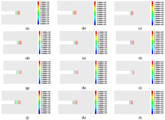 Characteristics of the seepage field of the surrounding rock when the tunnel is approaching to fault with different water pressures (Unit: Pa): (a) p = 1 MPa, fourth excavation; (b) p = 1 MPa, fifth excavation; (c) p = 1 MPa, sixth excavation; (d) p = 1.5 MPa, fourth excavation; (e) p = 1.5 MPa, fifth excavation; (f) p = 1.5 MPa, sixth excavation; (g) p = 2 MPa, fourth excavation; (h) p = 2 MPa, fifth excavation; (i) p = 2 MPa, sixth excavation; (j) p = 2.5 MPa, third excavation; (k) p = 2.5 MPa, fourth excavation; (l) p = 2.5 MPa, fifth excavation.