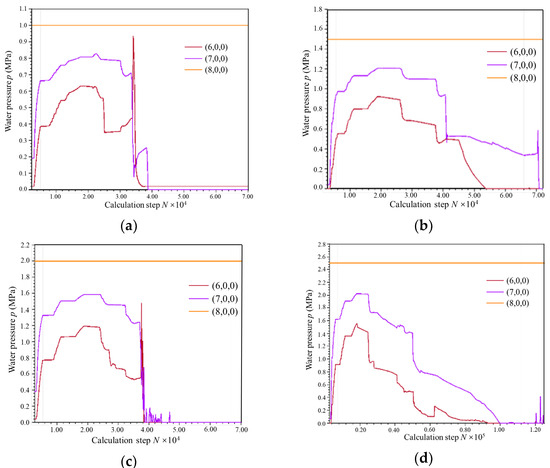 Water pressure change curve: (a) p = 1 MPa; (b) p = 1.5 MPa; (c) p = 2 MPa; (d) p = 2.5 MPa.