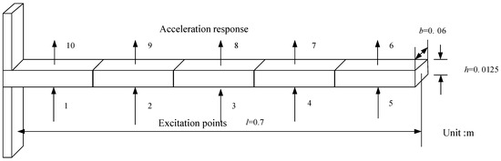 Figure 3 shows the aluminum cantilever beam that we used in the simulation, which also shows the size, locations of the excitation, and response points of the beam. Points 1 to 5 are excitations. Points 6 to 10 are responses. The elastic modulus E of the beam is set as 71 GPa. The density is 2700 kg/m3. The damping ratio is set as 0.002 for each mode. The analysis bandwidth is set from 0 to 800 Hz. The number of spectral lines is 1600.