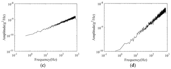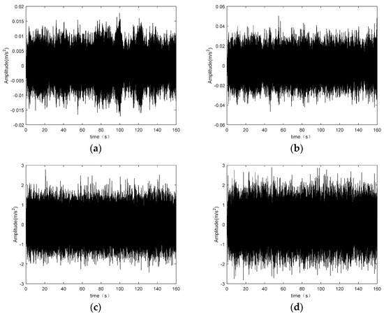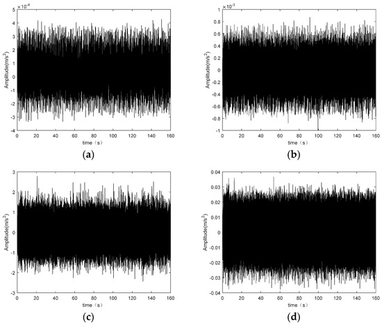 Figure 4a–d show the time-domain information of the four excitations at point 1. Figure 5a–d show the PSD of four types of excitations at point 1. The excitation information of other point signals is similar, so it will not be repeated. Figure 6a–d show the time-domain information of the response at point 10. Figure 7a–d show the PSD of the response at point 10. The information of other response points will not be repeated. Table 2 shows the chromaticity and its error identified based on the points near the first two modes under four different kinds of colored noise excitation.