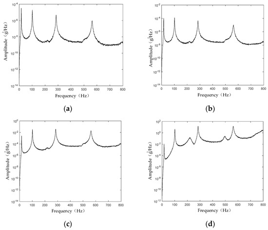 Frequency domain information of excitation point 1. (a) PSD when ρ = −1.2; (b) PSD when ρ = −0.8; (c) PSD when ρ = 0.4; (d) PSD when ρ = 0.6.