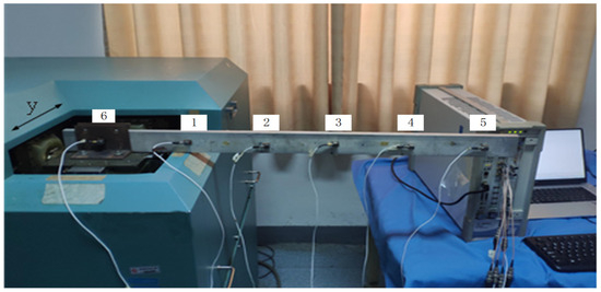 A schematic diagram of the cantilever beam is shown in Figure 8. The free size of the beam is 0.06 × 0.0125 × 1 m. The distance between adjacent accelerometers is 0.18 m. The colored noise excitation is provided by a three-axis vibration table. We selected Agilent VXI as the signal transmitter and data collector. The sampling frequency is set at 2560 Hz. In the experiment, pink noise was used as the excitation, with an effective value of 1 g.