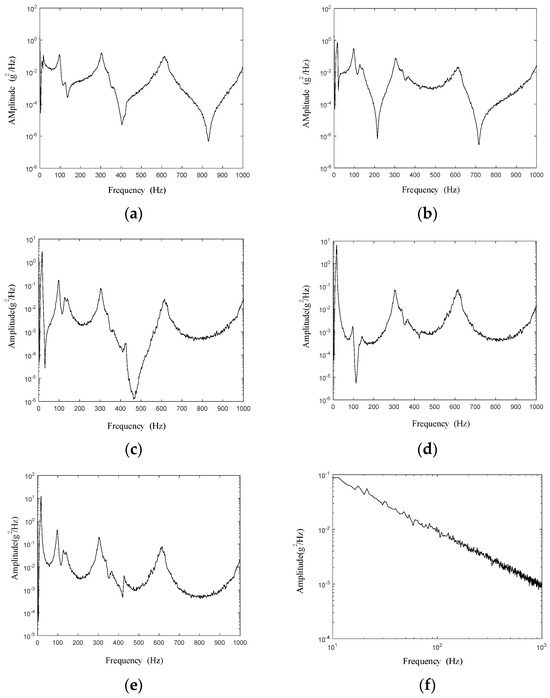 Frequency domain information of measured response at Points 1–6. (a) PSD of response point 1; (b) PSD of response point 2; (c) PSD of response point 3; (d) PSD of response point 4; (e) PSD of response point 5; (f) PSD of response point 6.