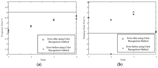 Modal parameter identification error before and after using CRT in the experiment. (a) Frequency error; (b) Damping ratio error.