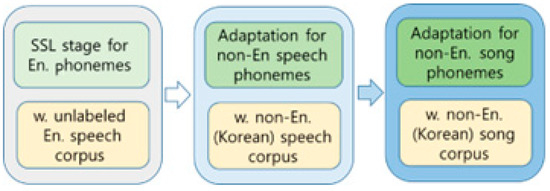 Figure 1 shows a flow diagram of the proposed method to build a Korean phoneme recognition model from Korean songs. In the first stage, the SSL model was trained to capture the general speech representation with 960 h of a large-scale English corpus. The pre-trained SSL model then adapts to a relatively small-scale 180 h of a Korean speech corpus. In that stage, the Korean phonemes were interpreted as similar to English ones. Finally, the Korean speech model was again adapted to the Korean song domain using 2.5 h of a tiny singing voice corpus. In this final adaptation, melodic supervision was chosen, which utilizes pitch information, particularly the onset of musical notes, to improve the performance. This was accomplished by employing a multi-task learning approach [14] that included pitch detection.