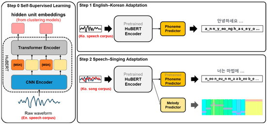 Figure 2 provides a detailed representation of Figure 1. In step 0, the self-supervised speech representation learning from English speech data is adopted in our method. Then, the two-step adaptation process is followed; in step 1, the learned English speech representation undergoes linguistic adaptation to Korean phonemes, while in step 2, Korean singing voices are adapted with melodic supervision.