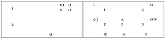 Vowel Charts of Korean (left) Phonemic Vowels and English (right) Phonemic Vowels [30,31].